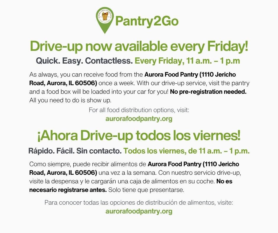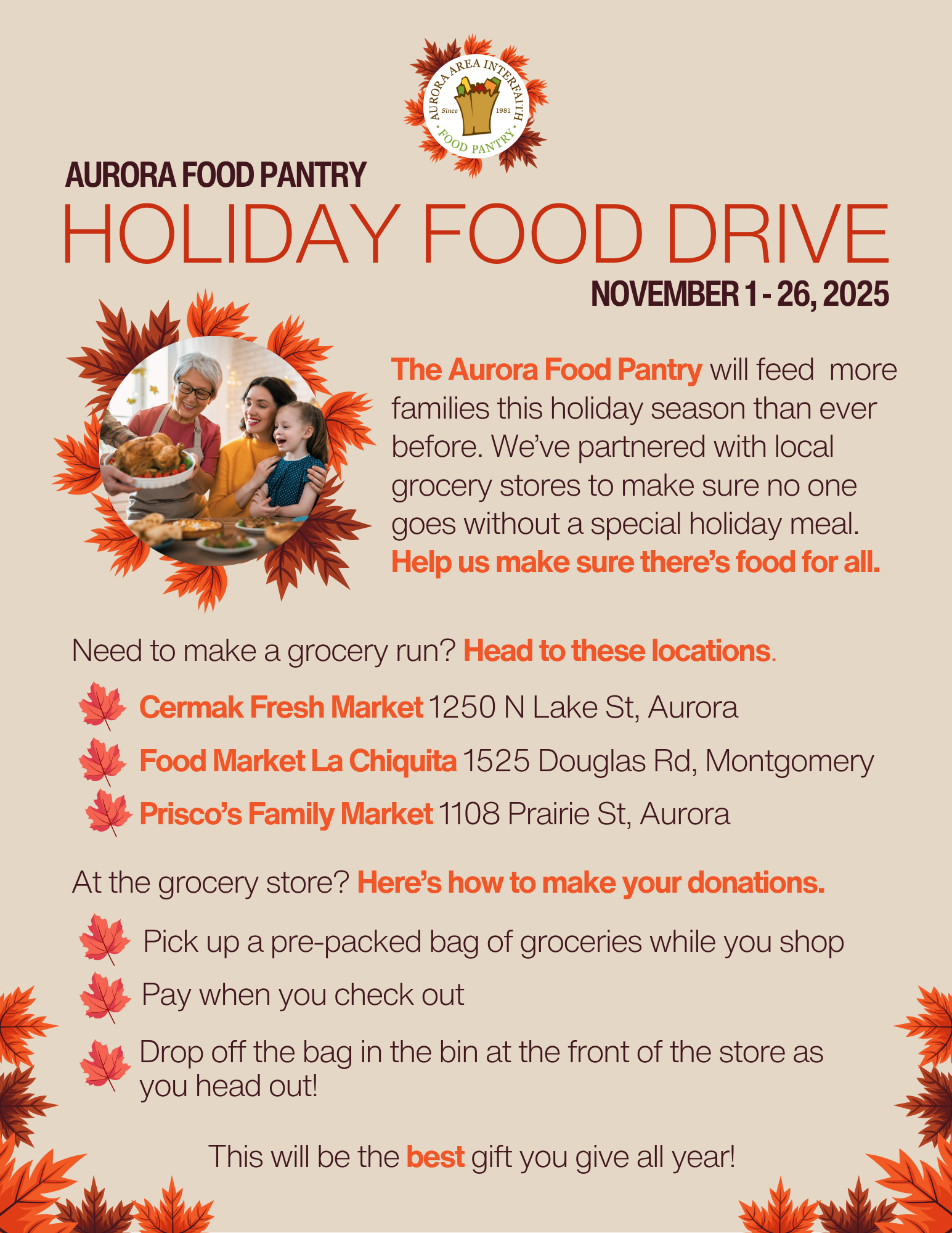 We’re making sure no one goes without a special, holiday meal. On November 1 – 26, we’ll be running our 18th Annual Holiday Food Drive. We’re partnering with three local grocery stores selling pre-packed bags of groceries for shoppers to purchase and donate to the pantry. Bags are available at Prisco’s Family Market and Cermak Fresh Market in Aurora and La Chiquita Food Market in Montgomery.